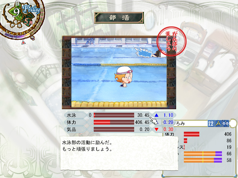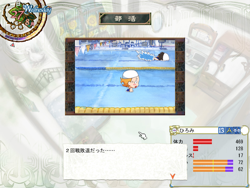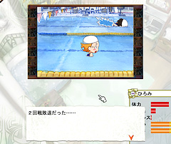 こうして1学期も終わり,8月末には部活動の大会があった。選手に抜擢されたひろみちゃんであったが,残念ながら2回戦で敗れてしまった。というのも,部活動だけでは水泳スキルの向上度合いが高くなく,この時点でのレベルはまだ0なのであった。2回戦に進めただけでも御の字だろう。