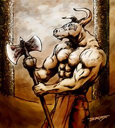 ミノタウロスは獣人型のモンスターで,牛の頭に人間の体を持つ異形として描かれることが多い。人間よりも数回り大きな体躯をしており,斧や棍棒といった武器を好んで使うほか,突進による体当たりや,角を用いた攻撃を繰り出すこともある。それらの攻撃はいずれも強力で,どれを受けても致命傷となりうるので,冒険者にとっては,かなりやっかいな存在といえるだろう。