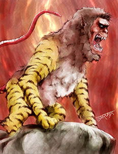 鵺は,基本的に中世ヨーロッパをベースとしたゲームに登場することはあまりないが,「和」をテーマにしたRPGには,欠かすことのできない存在。頭部は猿,胴体は狸,手足は虎,尾は蛇というモンスターである。言い伝えによっては,胴体を虎とすることや,尾を狐とすることもあるのだが,ある意味,和製キマイラといってもいいだろう。