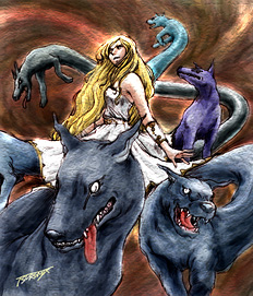 ギリシャ神話のスキュラは,シチリア沿岸のメッシーナ海峡にある洞窟に棲息し,洞窟から犬の首を出して待ちかまえ,通りがかった船を襲って船員を食らっていたという。魔法などを使うことはなさそうだが,一度に6頭もの犬(もしくはおぞましい獣)と戦わなければならないため,その手強さはかなりのものだ。