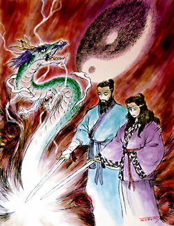 そんなとき,妻の莫耶(ばくや)が「今回は類い希なる名刀を作らなければならず,そのためには神の助力が不可欠でしょう。太古の昔より,神の加護を得るには神への貢ぎ物が必要です。必ず名剣を完成させてください」と話すと,自らの身を炉の中に投じてしまった。突然の出来事に干将は驚いてしまったが,なんと先ほどまで交わることがなかった金属が混じり合い,剣を鍛えられるようになったという。鬼気迫る作業を終えると,そこには2振りの剣が出来上がっていた。干将は陽剣(雄剣)に「干将」,陰剣(雌剣)に「莫耶」と名付け,莫耶のみを闔閭に献上したという。