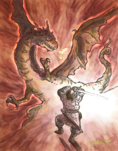 嫌々ながらも出発したジャイルズは,偶然にもドラゴンと遭遇。カウディモルダクスを見たドラゴンは,それがドラゴンスレイヤーとして名高い剣と気づいて戦意を喪失,略奪と破壊をやめてしまった。剣の真価やドラゴンの気持ちなど知る余裕もないジャイルズは,剣を抜き払って振り回すと,剣は意志を持ったかのようにドラゴンを攻撃。こうしてジャイルズは勝利を収めてしまったのだ。