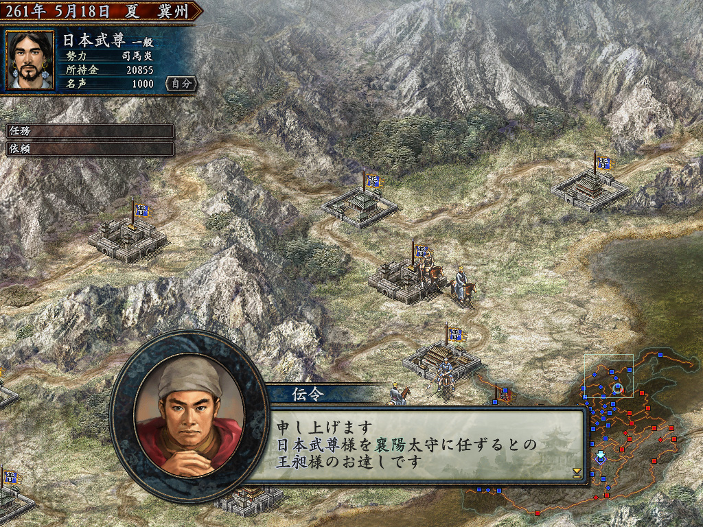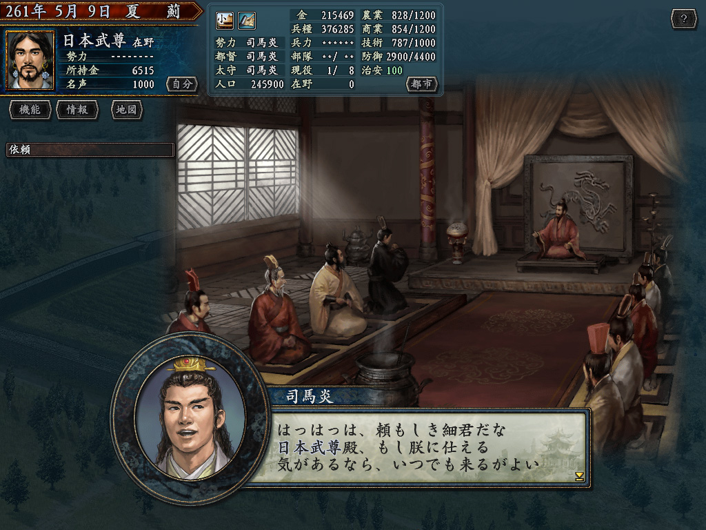 馬炎のいるケイの地で,しばしの休息&嫁との甘いひとときを過ごしたあと,呉の便宜を図るのに最も適した都市を手に入れるべく司馬炎に転属願いを出す。狙いは呉越に隣接する楚方面だ。