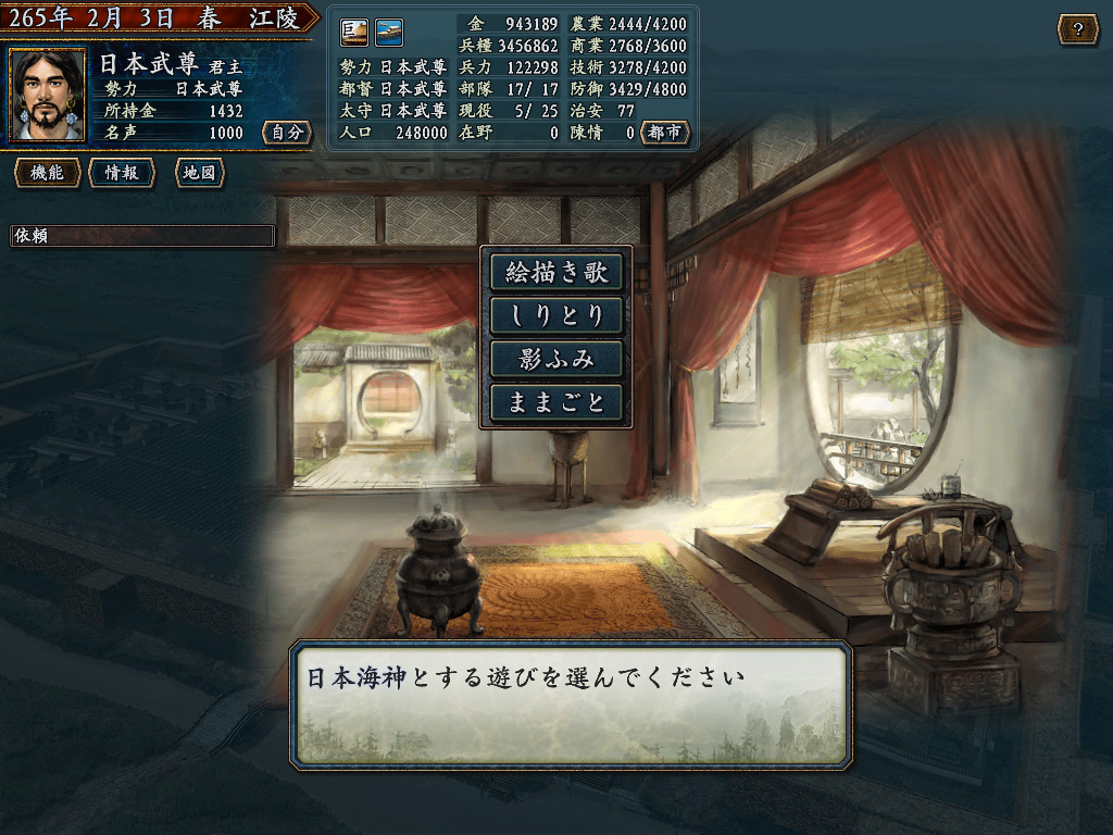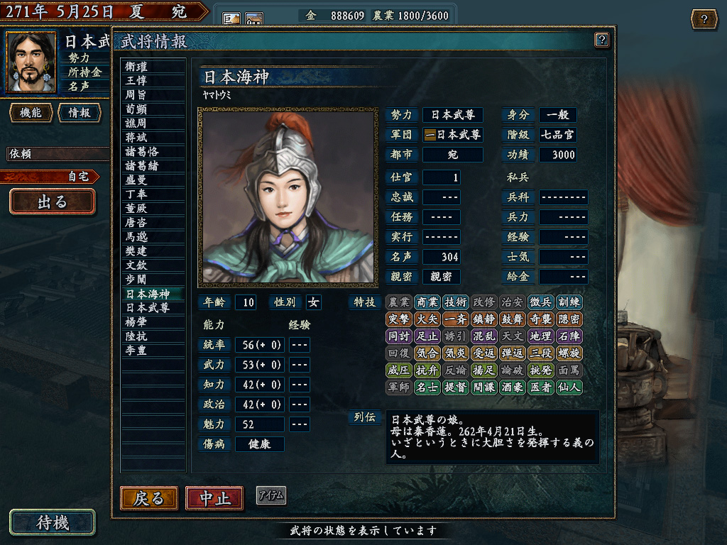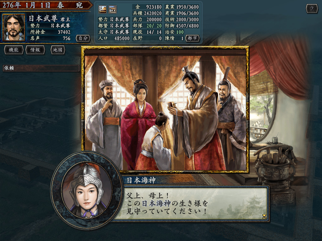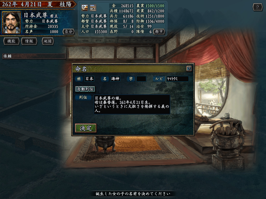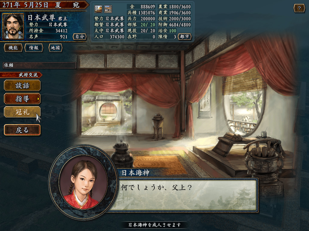 日本海神が生まれてから1ヵ月以上が経過したところで,義兄弟の諸葛カクや陸抗たちを交えて「満月の会」を開いた。このとき子供を将来どういう方向に進ませるかの選択があったが,時代が乱世ということもあるので「武の道」を歩ませることを選択。おそらくこのとき「文の道」や「徳の道」を選べば,また変わった能力に決まっていくのだろう。