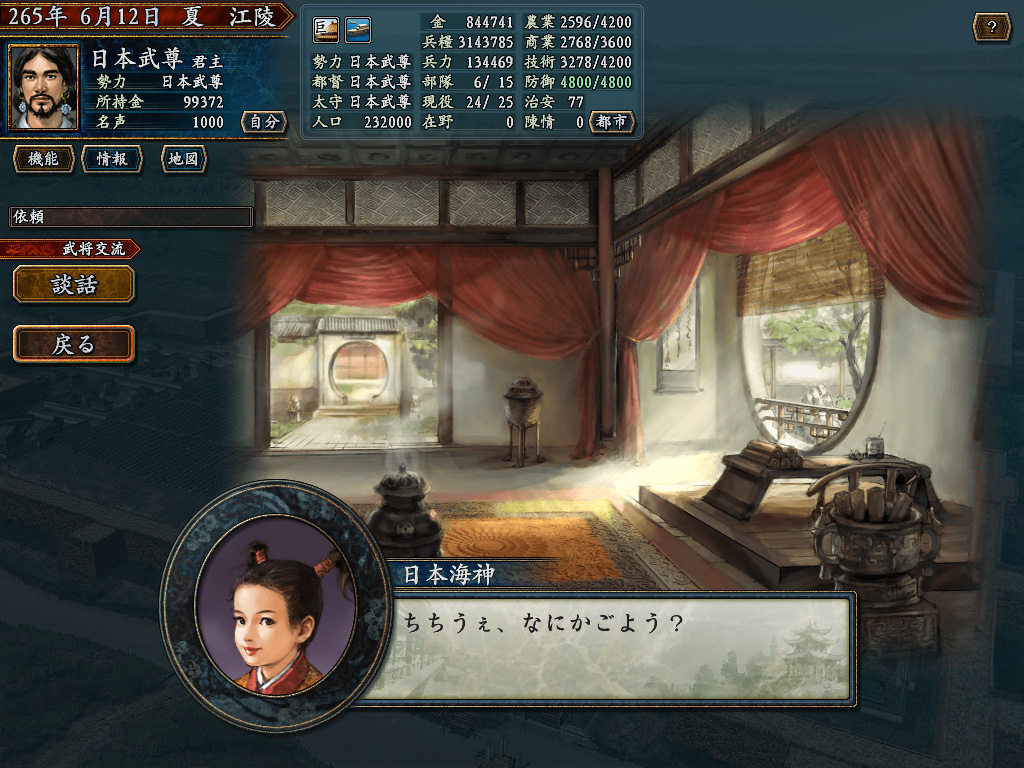 対策に奔走させられたワタクシだが,ちょうど日本海神が誕生したころは晋の猛攻を一しきり凌ぎきったところだったので,娘の成長を見守るには絶好のタイミングであった。戦闘は有能な諸葛カクや陸抗などに任せて,ワタクシはもっぱら自宅に入りびたって嫁&愛娘との談話に専念。