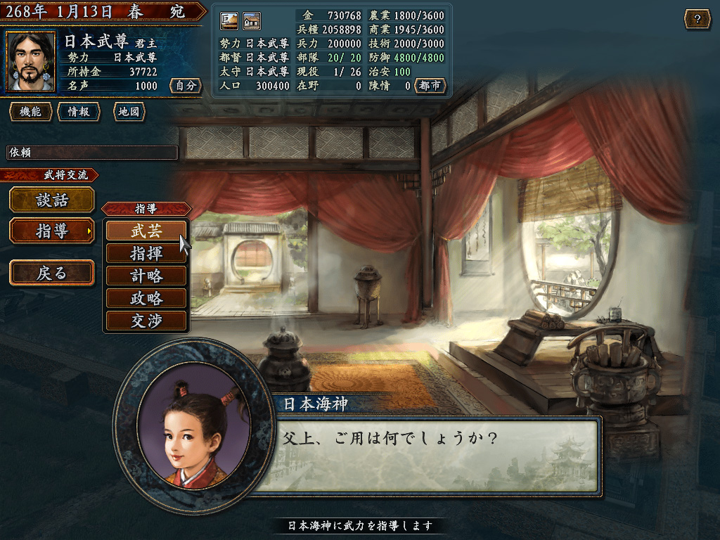 供が7歳以上になると,談話だけではなく「指導」も行えるようになった。これまでワタクシと日本海神は簡単な会話のやり取りしかできなかったが,指導では自分の好きな方面に技能を伸ばせる点が楽しい。とくにワタクシはすべての特技を修得するスーパー武将なので,愛娘にもぜひ全特技を修得してほしいと願っている。