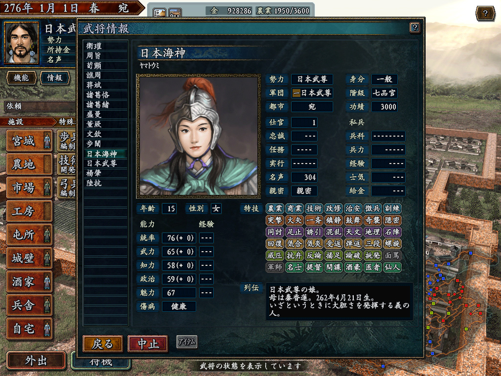 こうして愛娘との蜜月を過ごすこと8年。15歳になった日本海神が成人してワタクシの陣営の武将となる日がやってきた! 凛々しい愛娘の姿に思わず目頭が熱くなるワタクシ。しかし,悲劇は愛娘の能力を確認したときに起きてしまう……統率76・武力65・知力58・政治59・魅力67。