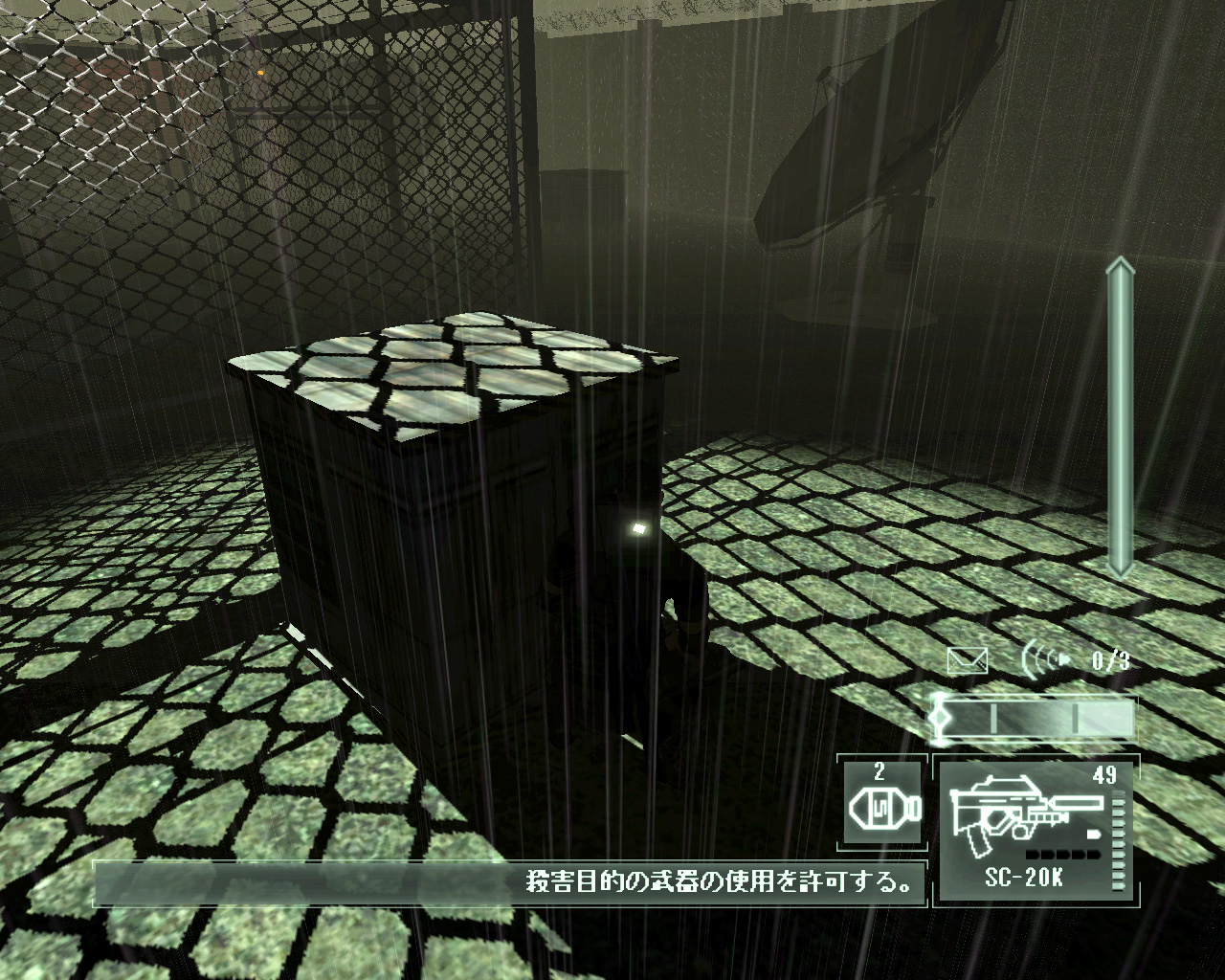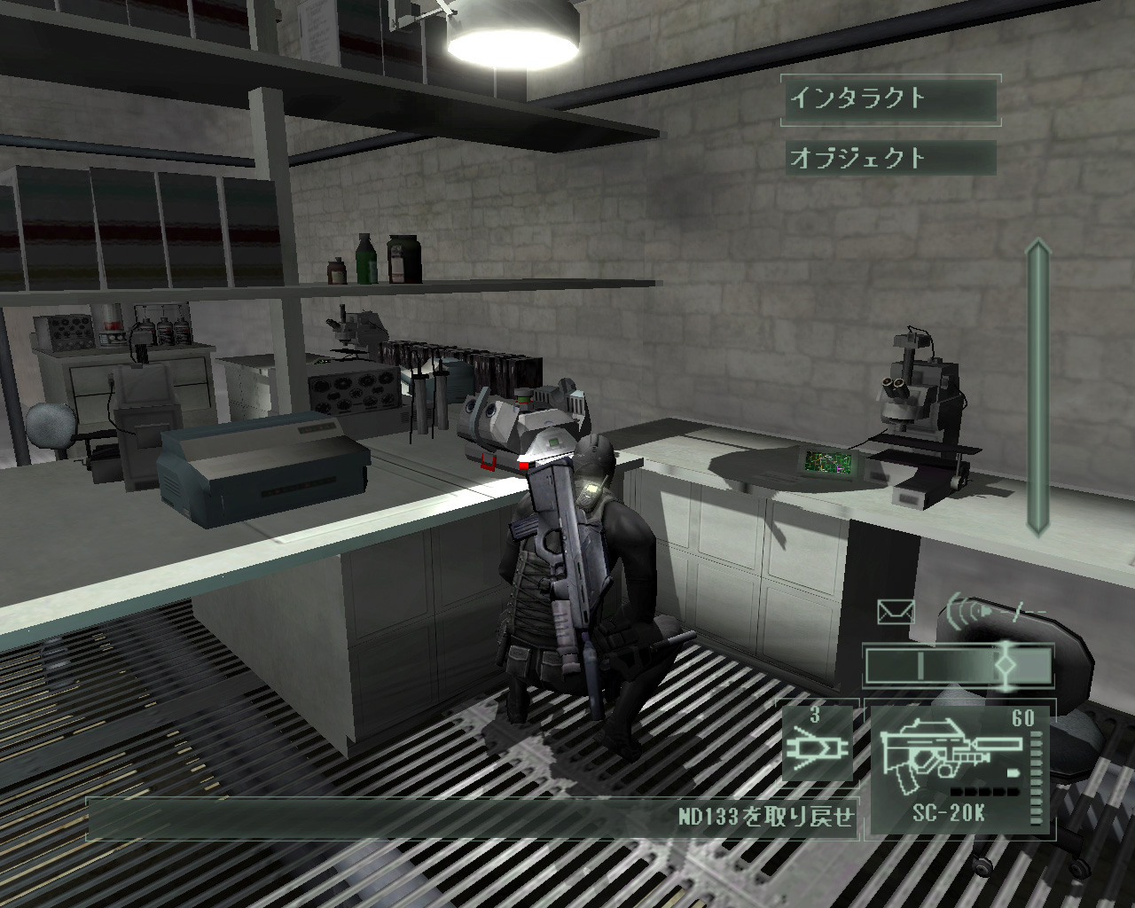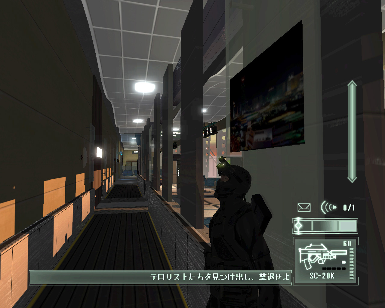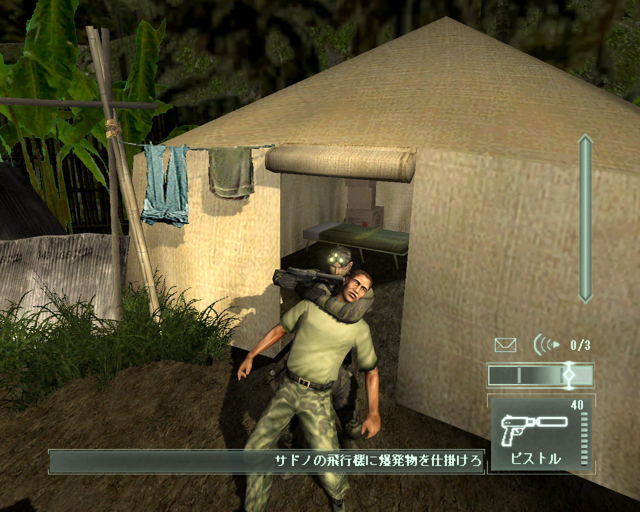 というわけで,「スプリンターセル パンドラトゥモロー 完全日本語版」の連載第2回である。さすが完全日本語版というだけあって,セリフも文字も日本語になっているのが非常に嬉しい。私は現在アメリカ在住で英語に堪能であり,この1年というもの英語版「Pandora Tomorrow」を繰り返し遊び尽くしてきたのだが,このたび日本語版をプレイして「あ,そういうことだったのか!」という新発見が一度ならずあり,私の英語力の程度が知れるというもので照れくさい。やはり,私にとって日本語は最高によく分かるといって過言でないだろう。日本語ラブ!