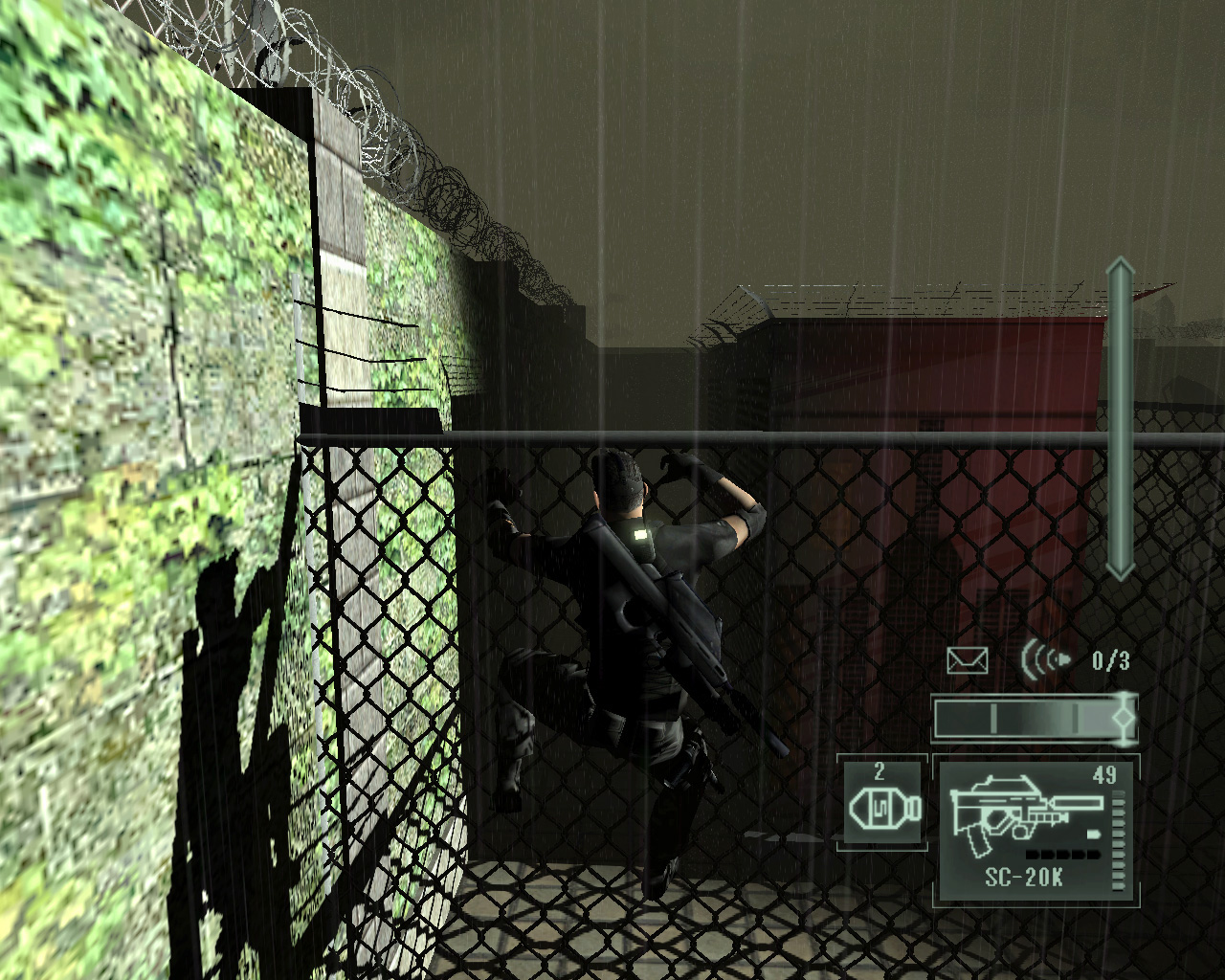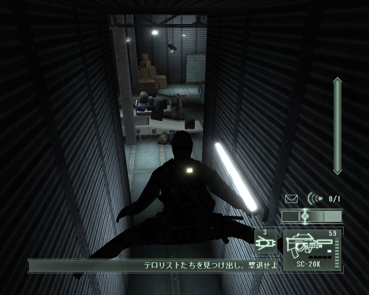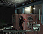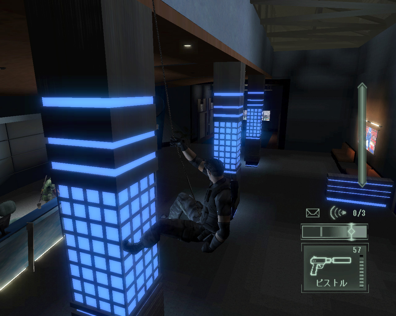 そんなサムのスニークを成功させる最大の要素が,彼のさまざまな肉体アクションだ。壁を伝い,柱を昇り,パイプにぶら下がる。一見,入れそうもない場所でも,多彩な動きを使って密やかに潜入する。マニュアルにはやたらいろんなアクションが載っており,ぱっと見は難しそうだが,このあたりのインタフェースはよく練り込まれてある。実際にプレイしてみると,一度に二つ以上のことを考えられない筆者でも,簡単にサムを操れるのだ。