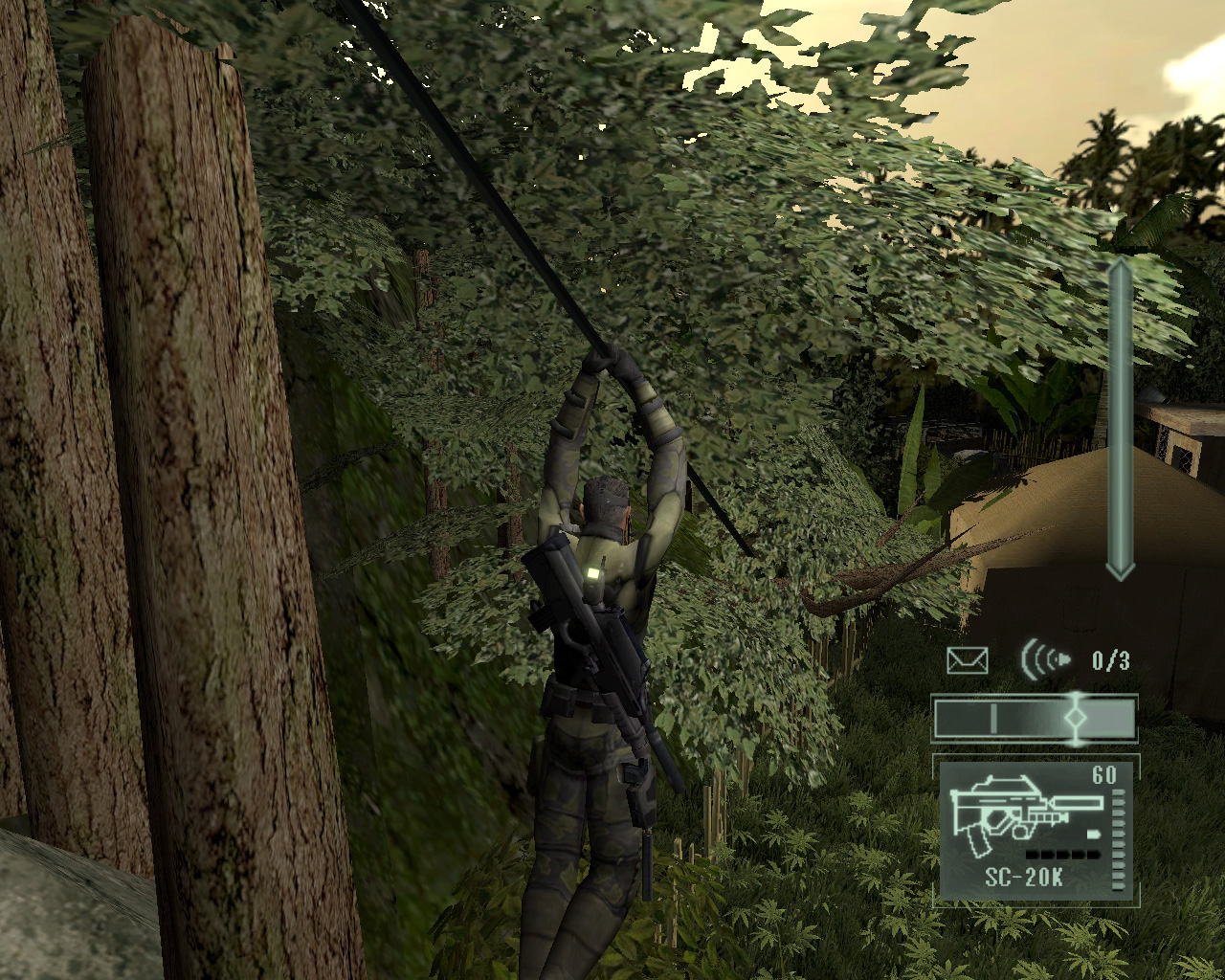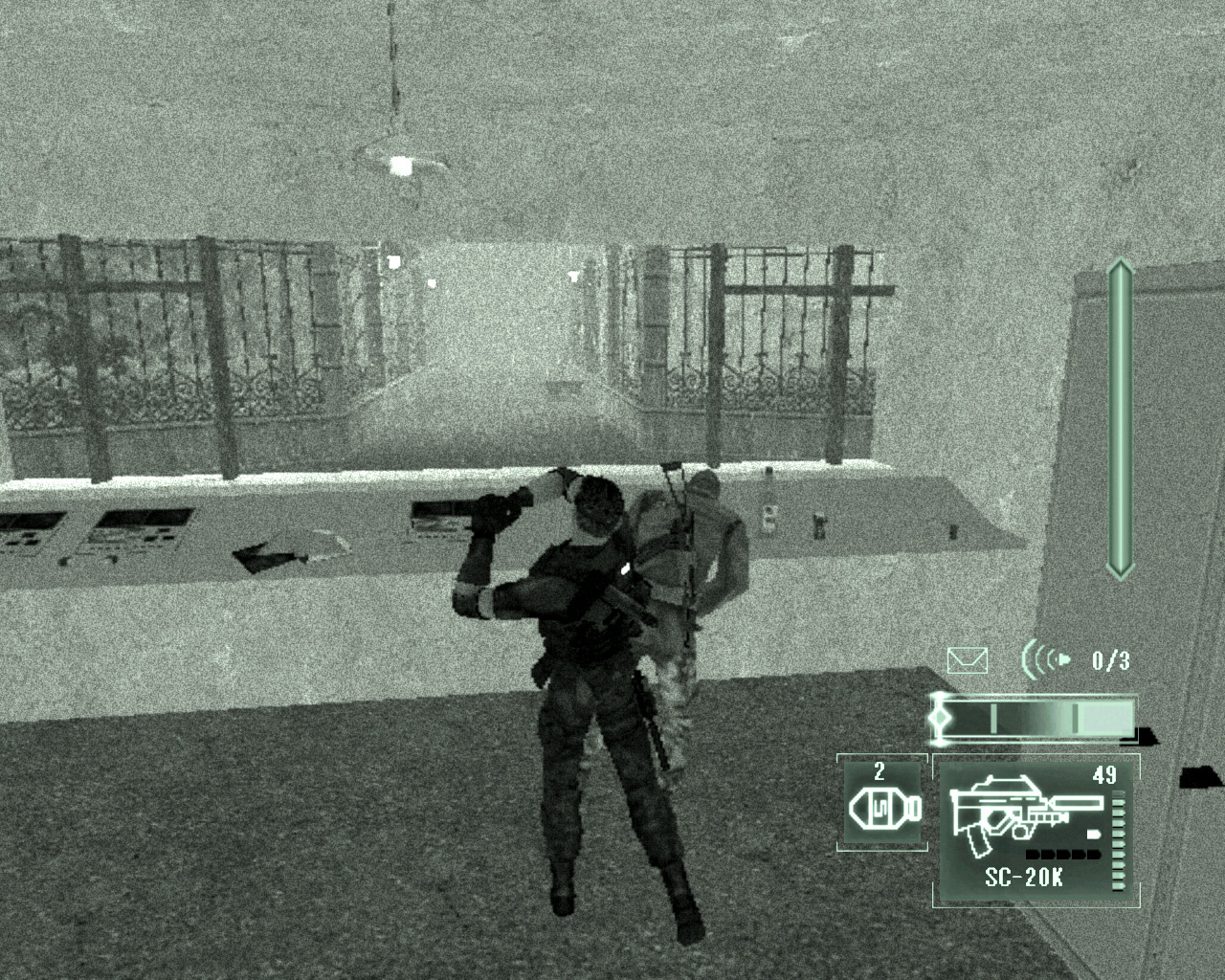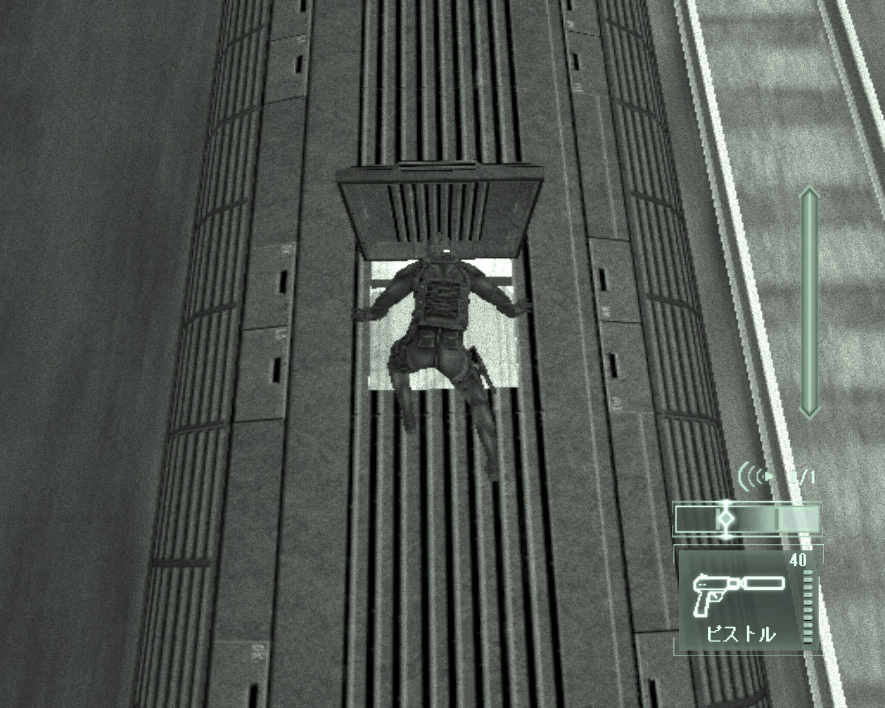 そんなサムのスニークを成功させる最大の要素が,彼のさまざまな肉体アクションだ。壁を伝い,柱を昇り,パイプにぶら下がる。一見,入れそうもない場所でも,多彩な動きを使って密やかに潜入する。マニュアルにはやたらいろんなアクションが載っており,ぱっと見は難しそうだが,このあたりのインタフェースはよく練り込まれてある。実際にプレイしてみると,一度に二つ以上のことを考えられない筆者でも,簡単にサムを操れるのだ。