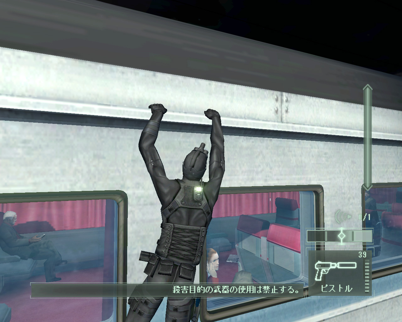 | デモ版でおなじみ,猛スピードで走っているTGVの車体の下を移動するサム。標的に近づくためなら手段を選ばないのがスパイの非情の掟だ |
