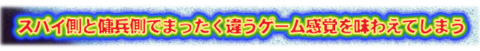 とはいえ,「どちらかが有利不利」というのはあると思う。ネット世界に跳梁する神技スパイも多くいるが,私のようなヌルめのプレイヤーには,どうも傭兵側のほうが分かりやすい(勝ちやすいというわけではない)。傭兵は「スパイを発見して攻撃を加え,これを取り除く」という単純な行動原理に則ってプレイすればいいし,殺される心配も少ないし(ゼロではない。スパイに絞め殺されると,かなりの屈辱感を味わえるぞ),敵を見失っても,やつらはいずれND133Kのところへやってくるのだ。