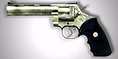 .357 コルトパイソン コルト社の大型リボルバー銃でマグナム弾を6発装填できる。使用する弾丸は約9mmだが,"9mmハンドガン"の9mmパラベラム弾とは桁違いのパワーを誇る。理由はマグナム弾にあり,これは通常の拳銃弾の倍以上の火薬量がある強装弾薬のこと。 |