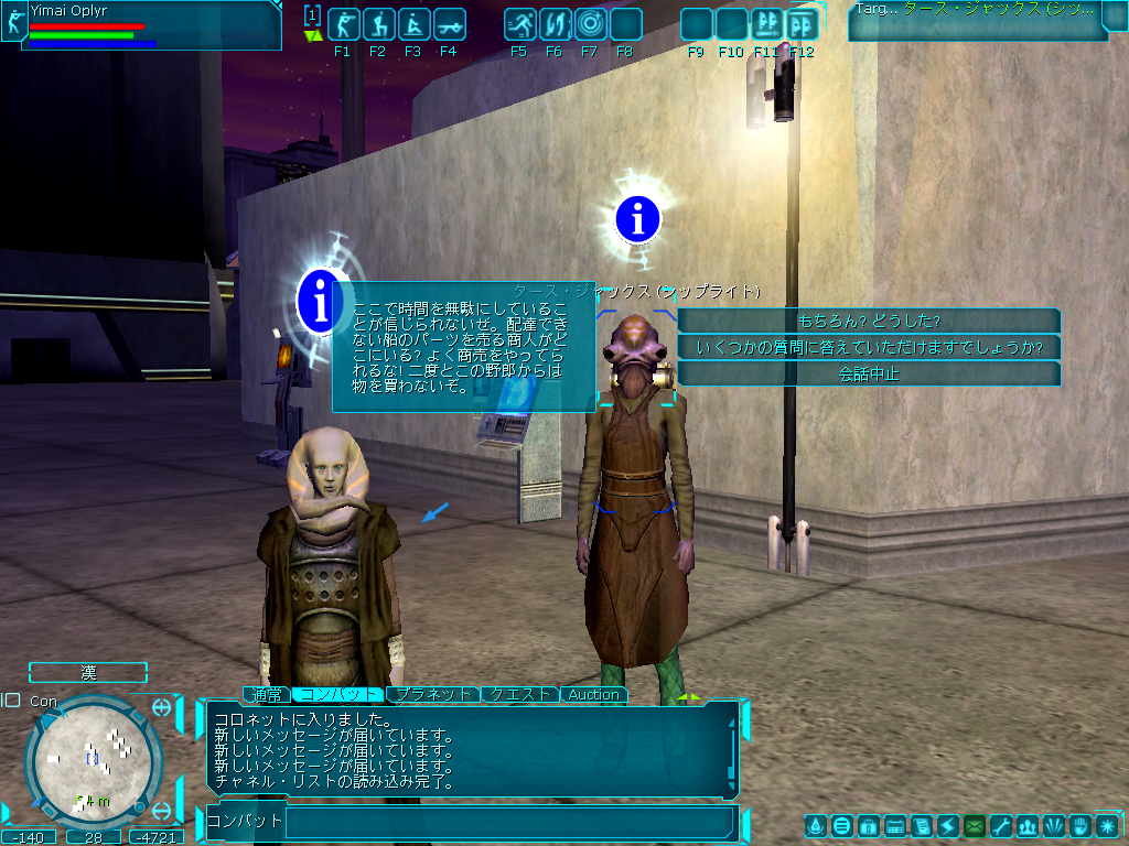 さらに「この世界の"魔法"に当たるものが絶対用意されているはずだ。ナノとか」と,不毛な調査を続けたりもした。そんなものは,ないのである。挙げ句,苦し紛れに導き出した予想が「ジェダイのフォースが魔法に当たるのかな?」である。これもかなり間違った認識で,SWGの世界にフォースは確かにあるが,これは本当に特別なもので,通常のプレイの戦術の一部としてこれを意識することはまったくない。「ミュージシャンはどうせバードでしょ」と身勝手に断じようとしたあたりで,ようやくSWGを既存のMMOに無理やり当てはめようとする愚かさに気がついた。