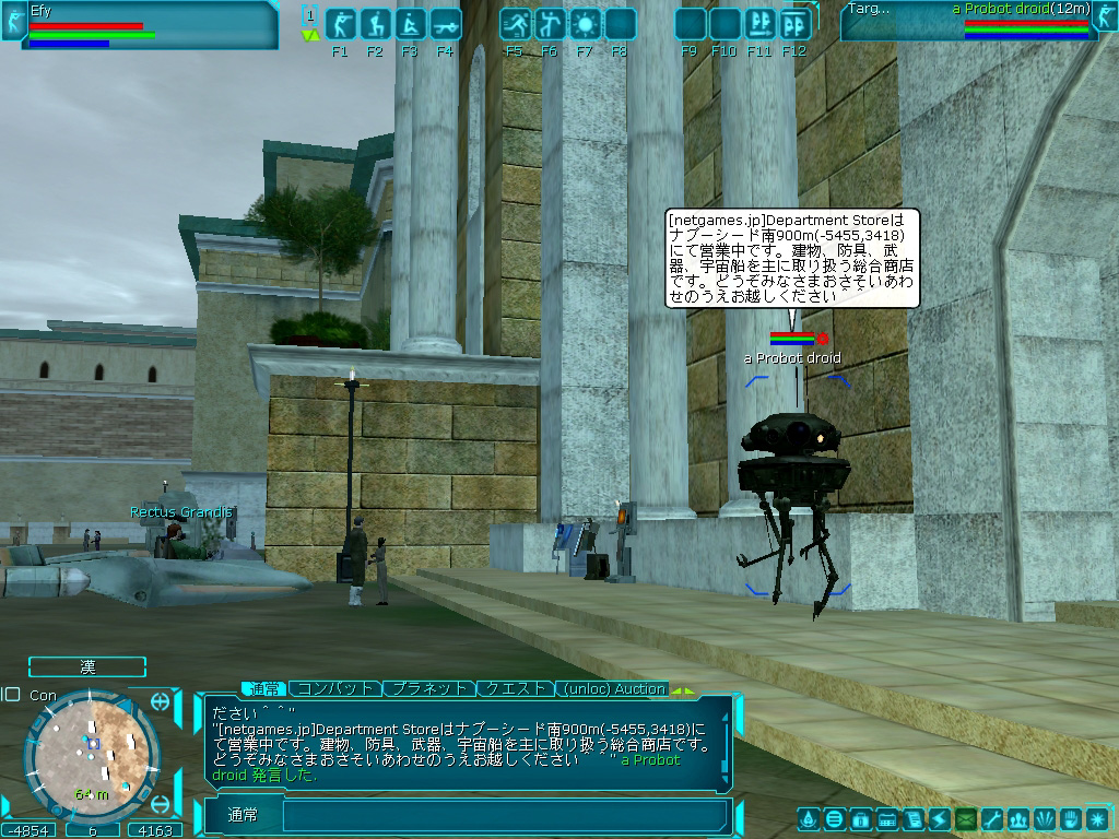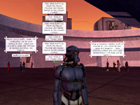 | とある日の英語サーバーの様子。コロネットのスターポートには多くの人々が集まり,ショップやステータスアップ販売の宣伝をしていた | 正式サービス開始後,間もない日本語版サーバーの様子。シードの駅前ではすでに宣伝用のドロイドを見かけることができた |