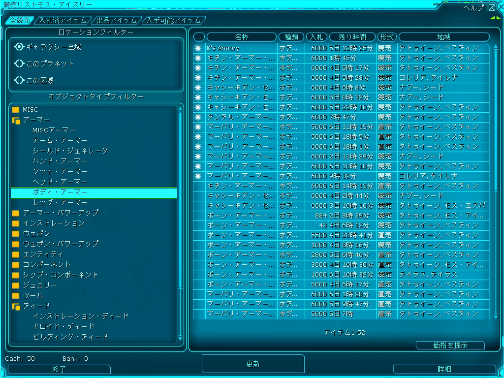 | バザー・ターミナルは銀河の至るところに設置されている。どのターミナルからでも銀河中の出品物にアクセス可能なので,とても便利 | バザー・ターミナルにアクセスすると,こんなウインドウが開く。いま自分がいる地域で出品されているアイテムであれば,その場で購入が可能だ |