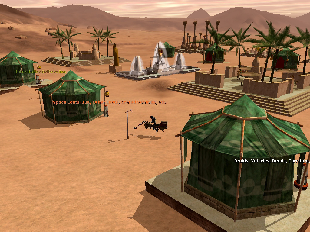 SWGでは,惑星上に自分の家を建てることができ,そこに家具を設置したり,アイテムを蓄えたりできるほか,ベンダーを雇って店番をさせることが可能だ。ベンダーを雇うには特定のスキルが必要で,さらに給料を払う必要があるが,付けられる値段に上限はないため,バザー・ターミナルを使っていたときよりも規模の大きな商売ができるようになる。お客さんが訪れることを想像しながら店の内装を整えるのは,非常に楽しい作業だ。