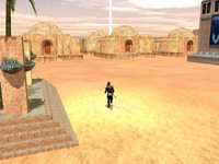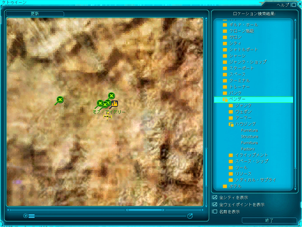 | プラネタリー・マップを使って他プレイヤーのショップの位置情報を得る。日本語版では今後どんどんショップが増えていくだろう | 位置情報が光の柱で示されるウェイポイントの機能を使って,目的のショップを目指す。SWGのゲーム世界は本当に広いので移動は大変だ |