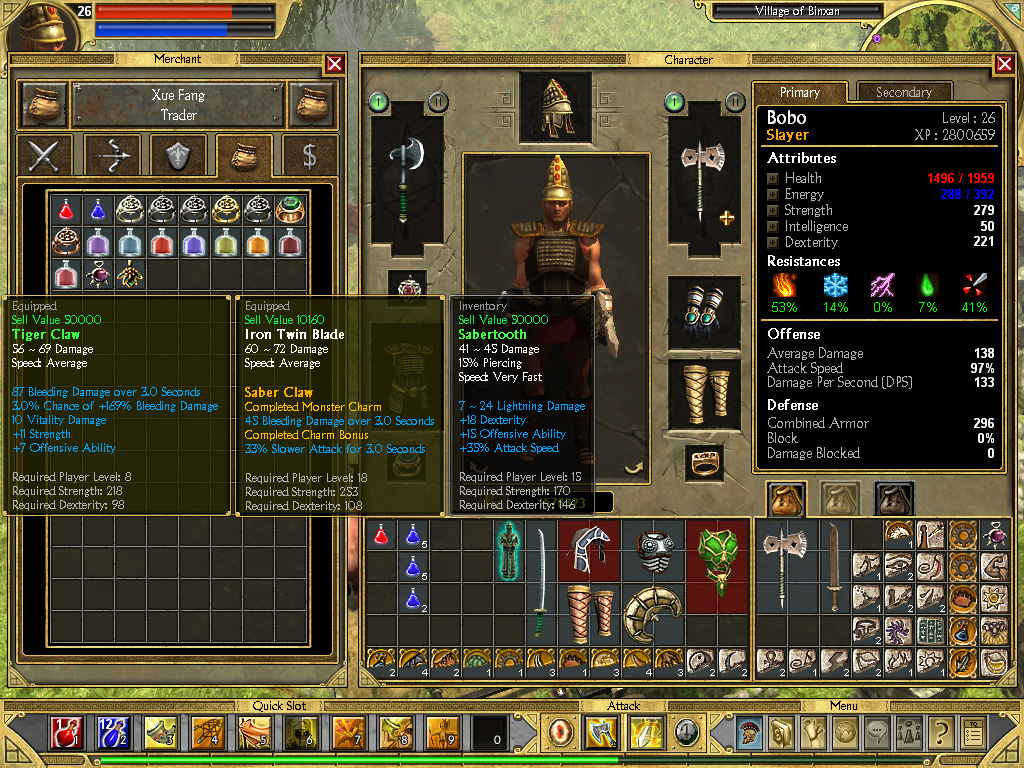 インベントリ内の装備アイテムにカーソルを当てると,現在装備しているものとの比較ができる。攻撃速度やDPS等が表示されるなど,この画面内だけでも情報量は多い |