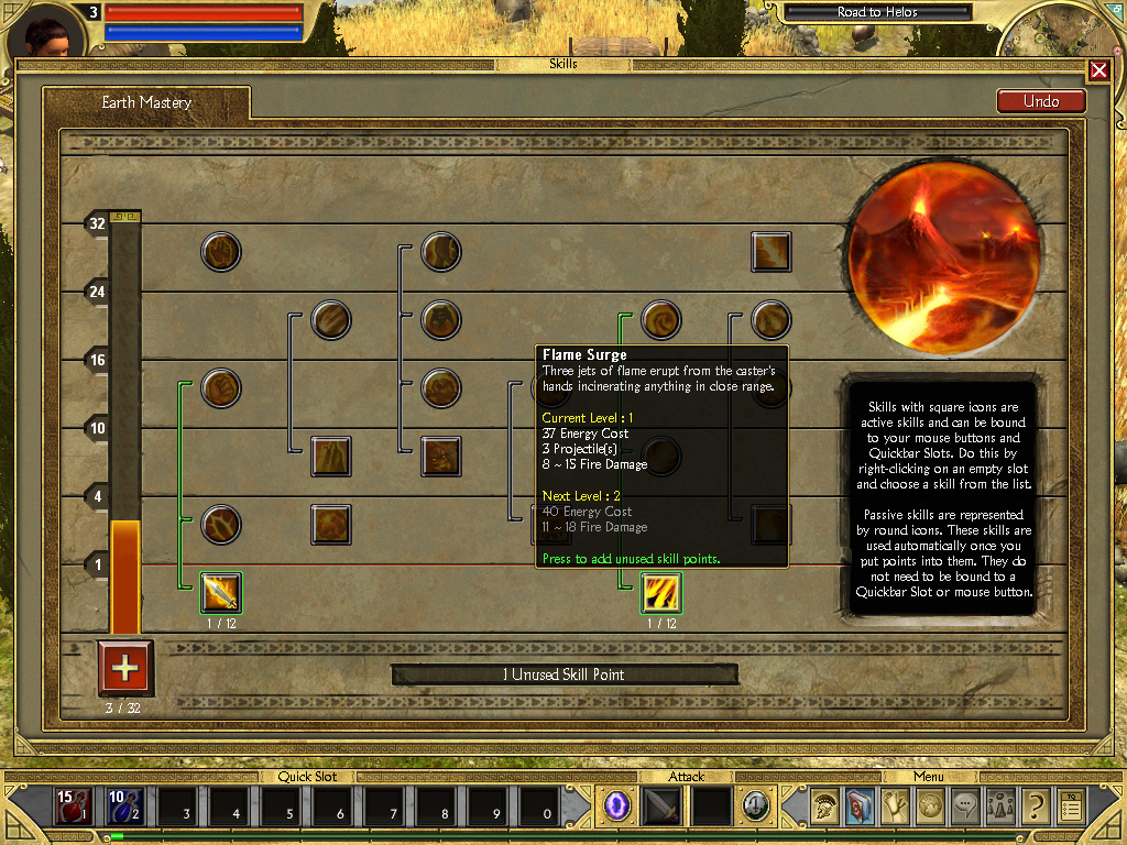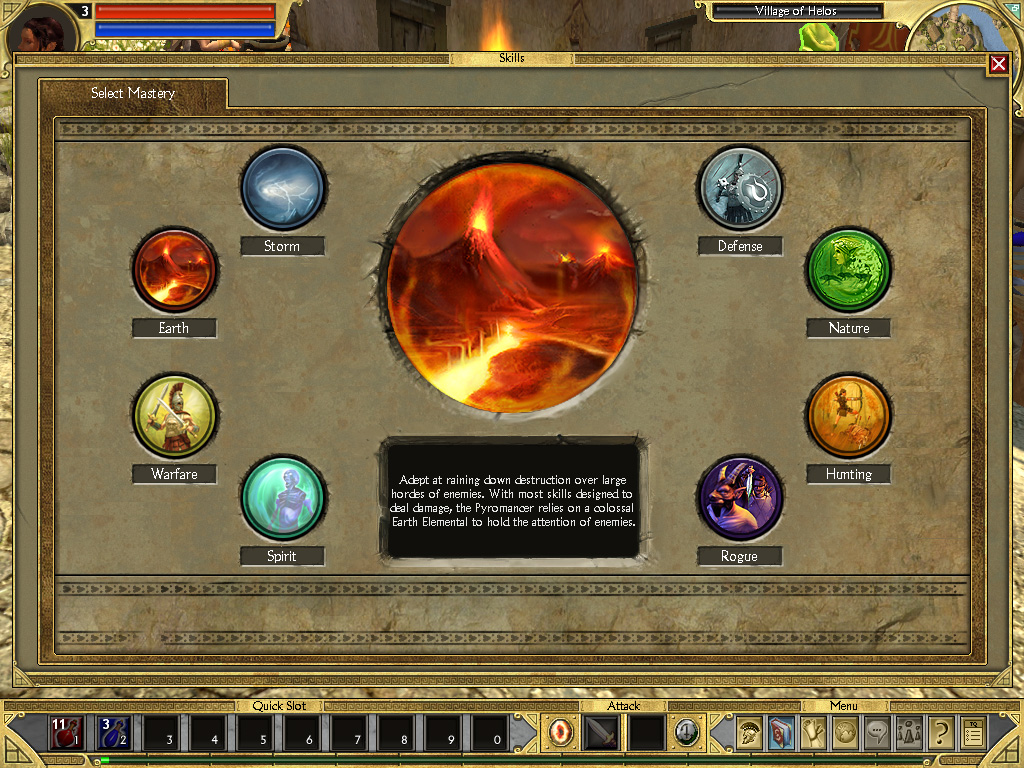 経験者ならご存じだろうが,Diablo IIの場合は一度割り振ったスキルポイントのリセットは不可能であった。しかしTitan Questでは,スキル選択時のリスクというものがほとんどない。一つのマスタリーを極めてもいいし,28通りある二つのマスタリーの組み合わせをいろいろ試してもいい。ポイントを注ぎ込んだスキルの組み合わせ次第で,あっと驚くような戦術が生まれるかもしれない。このあたりはコアゲーマーの心を揺さぶるシステムといえる。