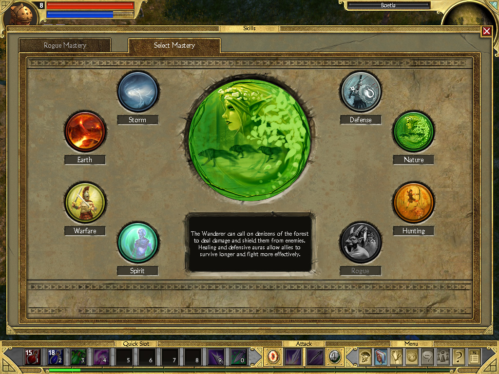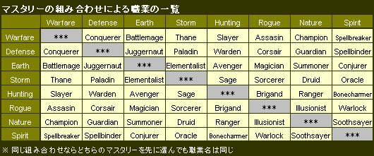本作におけるマスタリーとは,分かりやすく言うとジョブのようなものである。具体的には,「Warfare」「Defence」「Nature」「Spirit」「Earth」「Storm」「Rogue」「Hunting」の8種類がある。