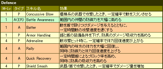 Warfareと同じく近接戦闘向けのマスタリーだが,こちらは防御面を重視している。戦士系のスキルを攻撃(Warfare)/防御(Defense)に分けたといえば分かりやすいだろう。とはいえ純粋な防御というよりは,盾で敵を殴って弱体化させるなど,「攻撃的な防御」といったイメージが強い。またDefenseでは,被攻撃時のタイミングで効果を発揮するタイプのスキルが多い。