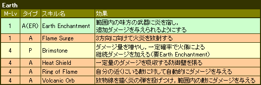 また火属性の攻撃面だけでなく,土属性による防御面も意外と充実している。例えば,下の表には含まれていないが,3段階目のスキルで土の精霊ペットを召喚でき,これが壁役としてとても役立つ。最初はマスタリーレベルを上げることに専念し,いきなり土の精霊ペット召喚スキルを覚えてもいいだろう。
