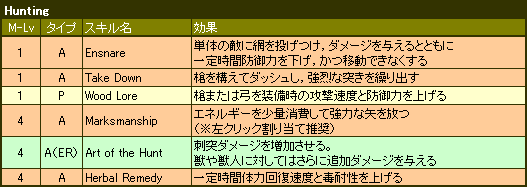 屋外活動に通じた,レンジャー的な性質のマスタリーである。片手用槍や弓を得意とするのだが,とくに弓に関するスキルが数多く含まれている。Huntingを選ぶからには弓を積極的に使っていきたい。本作の弓は攻撃間隔がやや長いものの,矢弾を消費しないためとても扱いやすいのだ。弓は攻撃速度が遅いため,ほかのマスタリーでは扱いづらい武器だが,Huntingでは弓矢や槍の攻撃速度を速める“Wood Lore”というスキルがある。