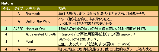 | Natureは召喚した狼に近距離攻撃を任せ,自身は遠距離から攻撃するのが基本戦術となる。攻撃面が少々強化しづらいので,もう一つのマスタリーで補う形になるだろう |