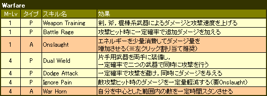 | 近接攻撃系のWarfareは,基本攻撃をサポートするスキルがぎっしりと詰まっている。アクションRPG初心者が悩んだら,一つめのマスタリーはWarfareを選ぶといい |
