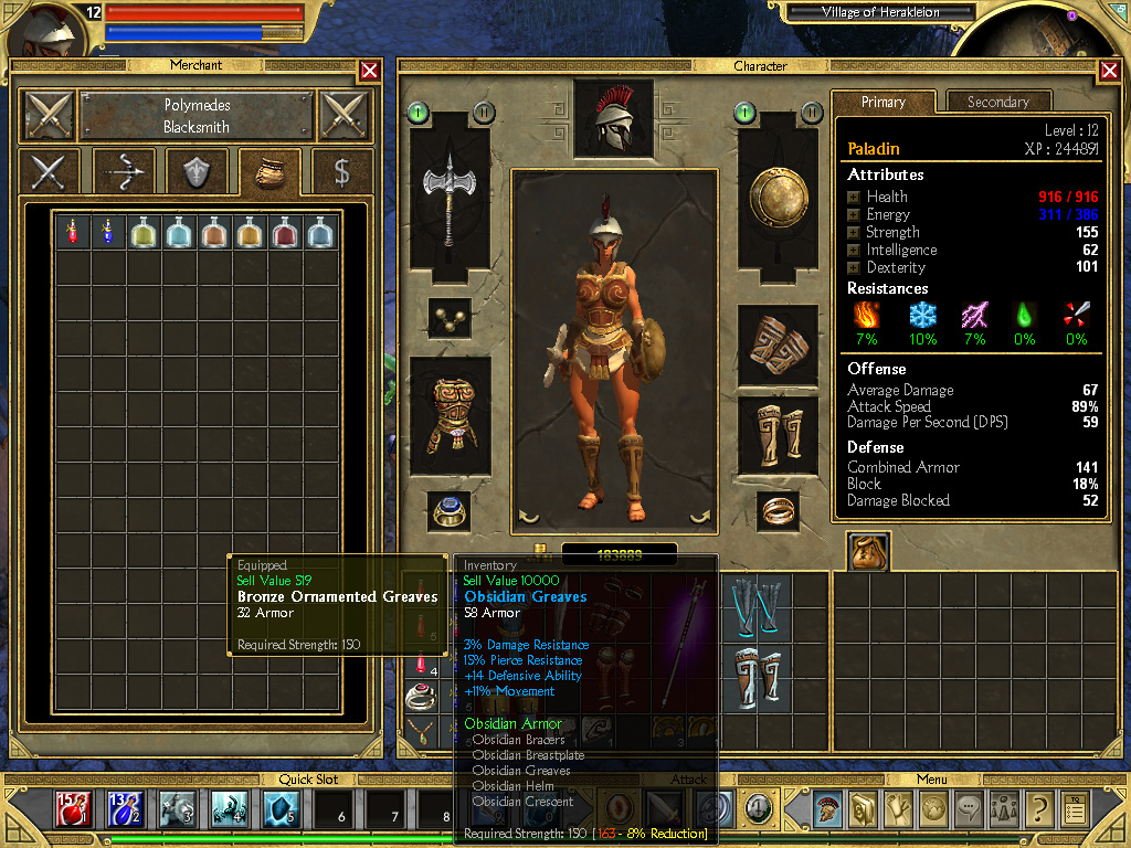 また,もう一つ重要なのが盾である。TITAN Questにおいて,盾の定義はArmor値とは別扱いとなっている。Shieldのステータスを見ると,「15% Chance to Block 34 Damage」というように表示されている。これは敵から攻撃を受けたとき「15%の確率でブロックし,発動したときはダメージを34軽減する」という意味である。要するに盾を持っていたほうがダメージを受けづらいということなのだが,分かりづらい場合は,序盤のザコ敵で盾あり/なしを試してみるといい。Health(ヒットポイント)の減り具合がかなり違うことが確認できるはずだ。序盤の敵は攻撃力もそれほど高くないので,基本的にはブロック率が高い盾を装備するといいだろう。
