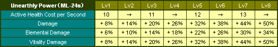 Unearthly Power:Dark Covenantの使用中,物理/魔法/バイタリティダメージ量が大幅に増加するが,体力消費量が大きくなる