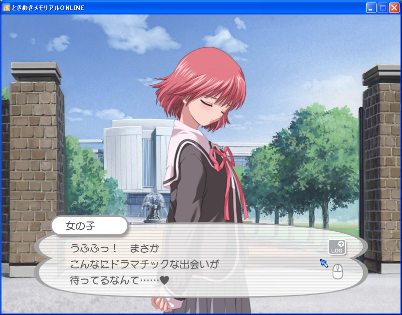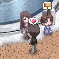 さて,僕の心境うんぬんの話は置いといて,TMOにおけるツーショットチャットについて,知らない人のために説明しておきましょう。これは,教室や校庭,体育館などで行う多人数でのチャットとは違い,指定した(もしくは指定してきた)生徒(つまり,ほかのプレイヤー)と二人きりで,お互いのキャラクターの8頭身キャラの画像を見ながらチャットをするというシステム。見た目が,歴代のときめきメモリアルシリーズの会話シーンに似ているというのもウリの一つです。また,アイコン一つでキャラの表情を変化させられるため,通常のチャットよりも細かな感情表現ができるというのもポイントです。