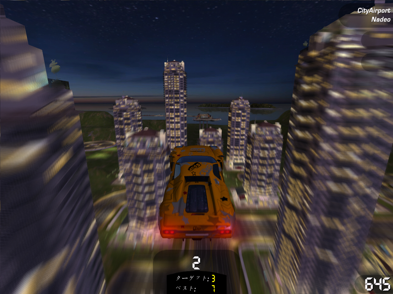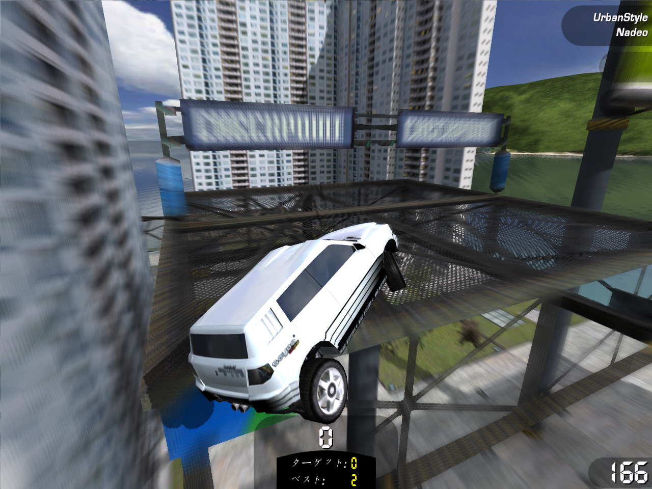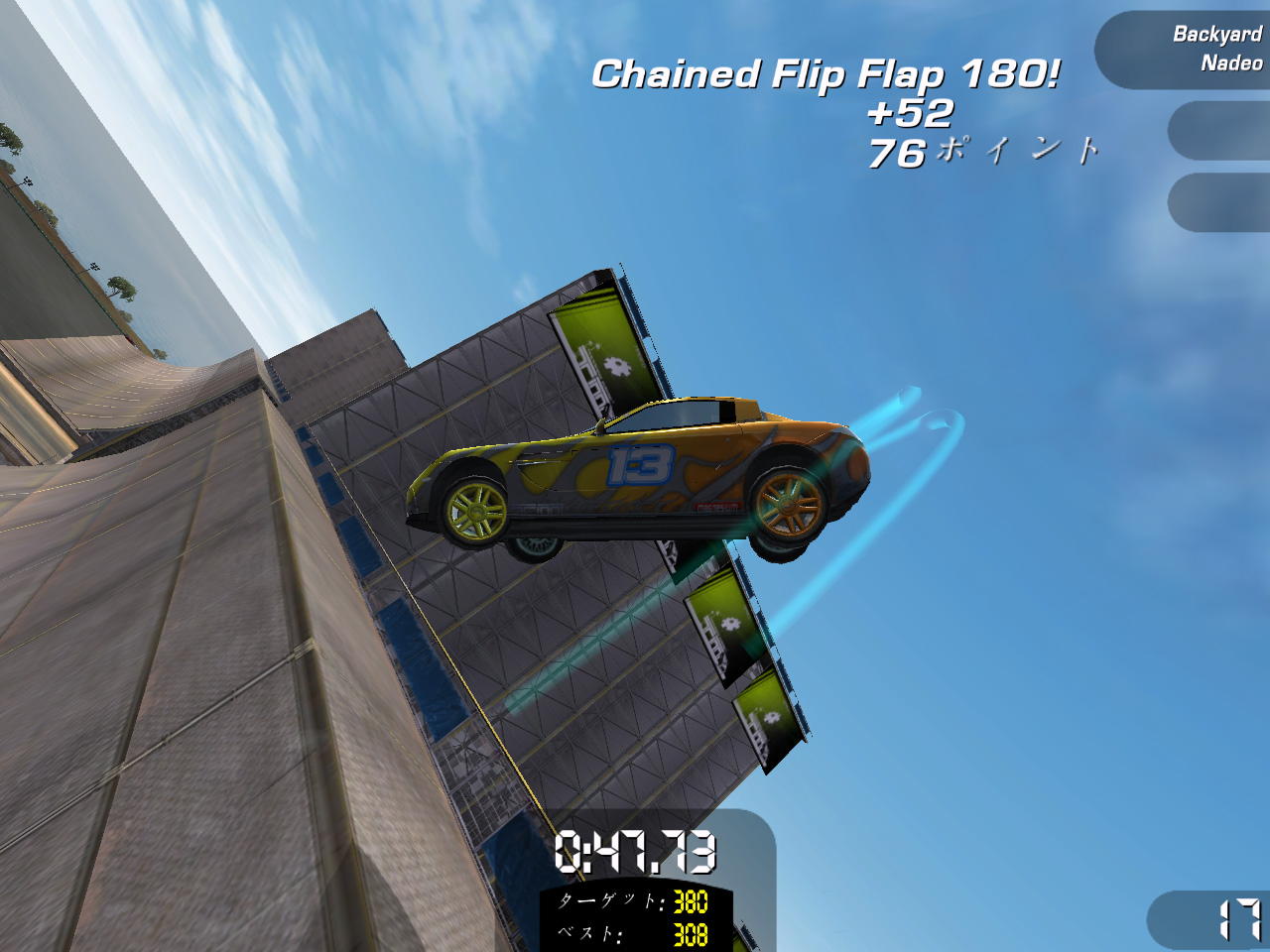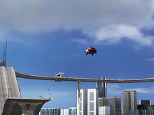 「スタント」チャレンジは,制限時間内にスタントアクション(技)を出しながらコースを走ったり,ジャンプ台を使ってド派手なスタントアクションを決めたりしてポイントを稼ぐ。滞空時間の長いジャンプをしたり,空中で何度も車が回転するようなジャンプを決めたりするとポイントが入る。どんなスタントアクションをするとポイントが入るのかは,マニュアルにも記述がないため種類など正確なところは不明だが,「Spin 180」「Chained Spin 360」「Aerial 360」など,スノーボード競技で見かけるようなアクションがある。同じ技を連続で繰り出したり,キレイな着地を決めるとボーナスポイントが加算されるなど,なかなか奥が深い。制限時間をオーバーするとフィニッシュラインを通過するまで稼いだポイントが減算されていくので,欲を出しすぎると損をする。