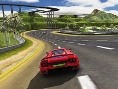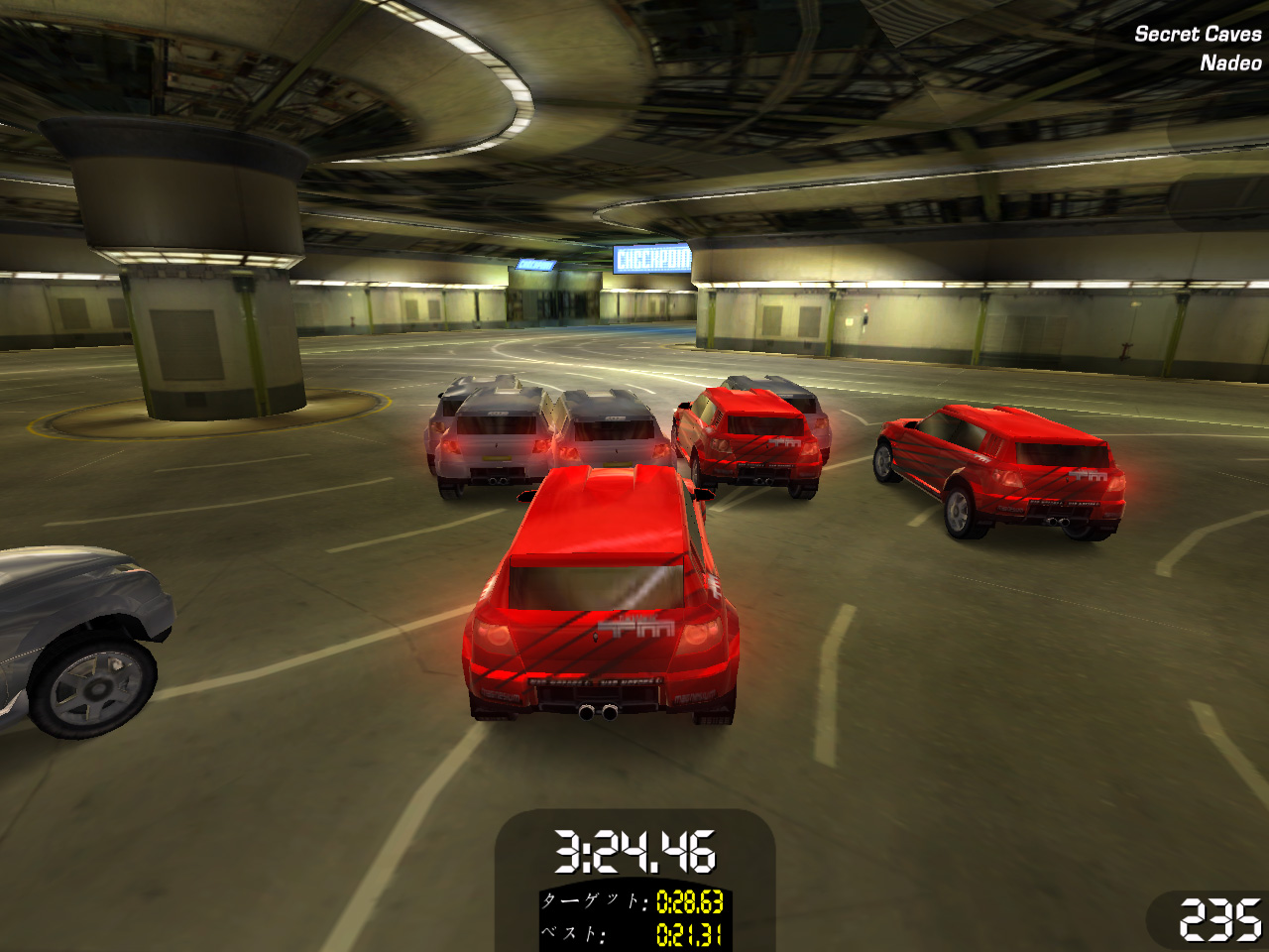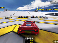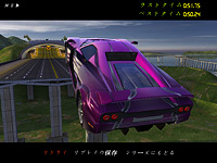 「クレイジー」チャレンジは,多くのライバルカーと同時にショートレースを行い,1台ずつライバルカーを打ち負かしていく。少々ややこしいのだが,例えば16台のライバルカーを相手にする場合,スタートと同時に16台+自分がワラワラと走り出す(ある意味,壮観)。ゴールした時点で自分よりも遅かったライバルカーが自分のチームとなり,これを繰り返して,すべてのライバルカーに勝つのが目的だ。はっきりいって同時走行する車が多く,ライバルカーとの当たり判定がないため,自車と重なり合ったり,かなりジャマくさい。しかも打ち負かしたライバルカーは自車と同じ色になって見づらくなるので(中央にいるので分かるが),味方が増えて嬉しいかどうかも微妙。なんとも不思議なチャレンジだ。