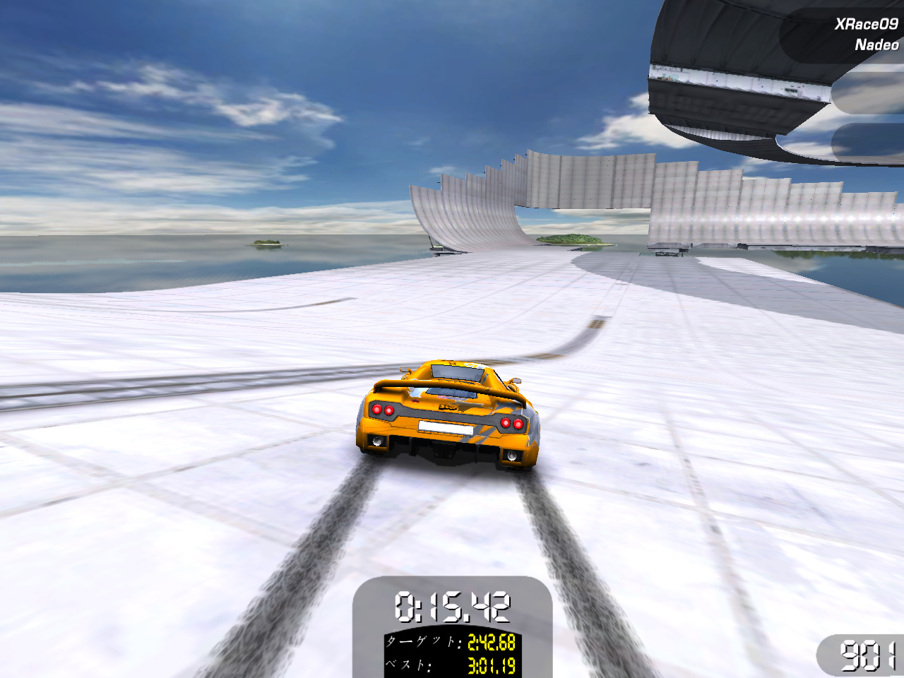 「レース」チャレンジと「エクストリームレース」チャレンジは,スタートからフィニッシュラインまでを可能な限り速く走ることに挑戦する。ライバルカーも同時に走るが,順位は関係なく,ターゲットタイムを切ることが目的。ライバルカーの走り=ターゲットタイムになっているため,彼らの前でフィニッシュする走りをすればよい。「エクストリームレース」チャレンジは,コースマップ全体を使うような大規模なコースが用意されており,「レース」チャレンジよりも攻め応えがある。シルバーメダルまでは比較的簡単に獲れるが,ゴールドメダルのターゲットタイムともなると,かなりシビア。明らかにショートカットを使わないと達成できないコースや,大ジャンプするとブースターを踏めずにタイムロスするコースもあるので,ライバルカーの走りを見つつ研究したいところだ。タイムアタックが好きな人は燃えること間違いなし。