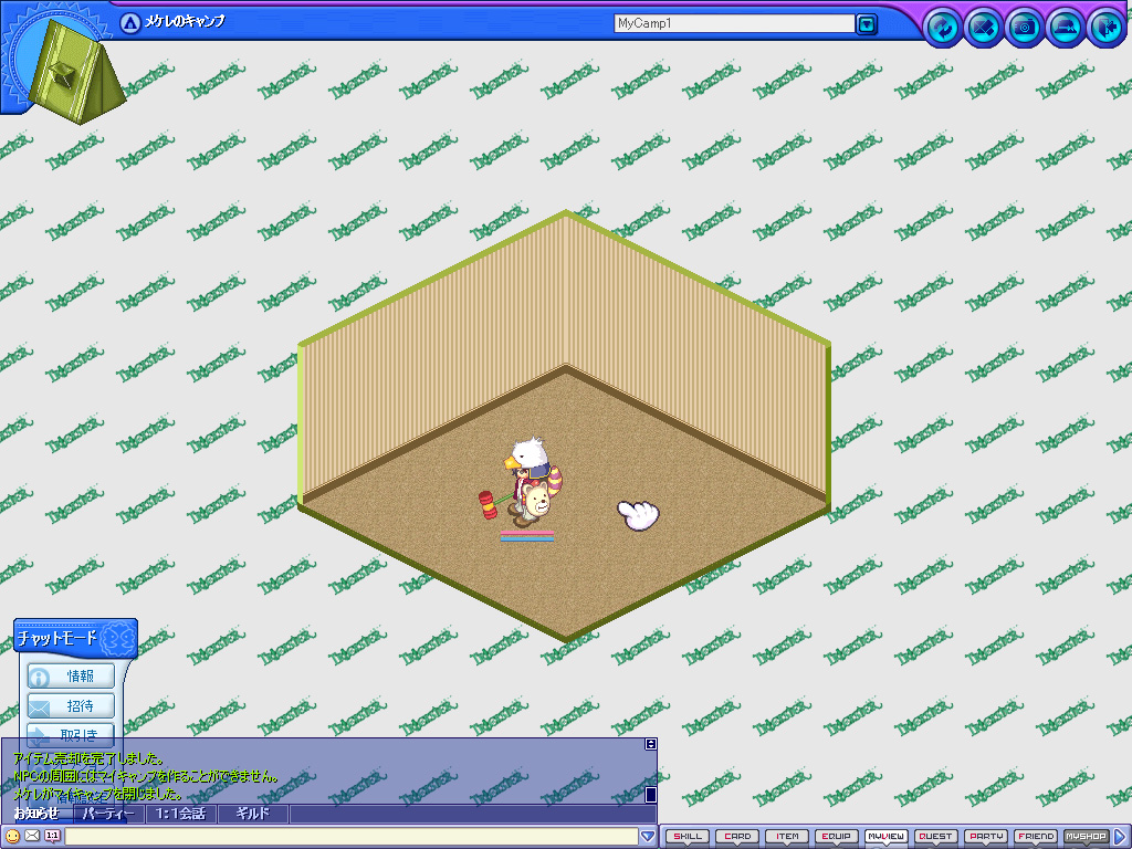また,今まで未実装だったマイキャンプの機能が使えるようになった。これは,町中やフィールドにテントを張り,自分の部屋を作れるシステムで,友人も中に招待できる。