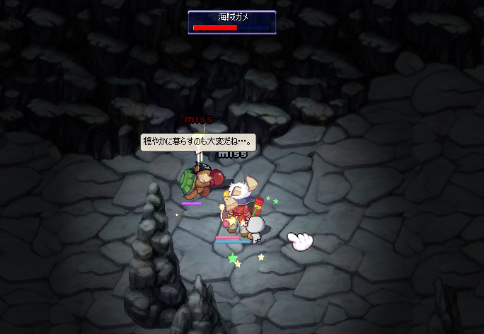 ダンジョンの中は,これまたおなじみというか,延々と亀クエストをクリアしてたおかげで正直見飽きた感もある,海賊ガメなどが出現するようである。初心者向けの土地に出入りするためのダンジョンにしては,アクティブモンスターが暗闇の中にゴロゴロいるというのはツラいような印象も受けるが,レベルの低いキャラでも走って通り抜けちゃえばどうにかなるか。