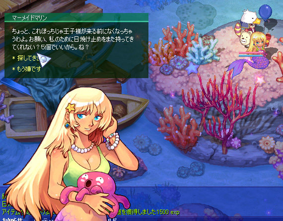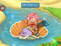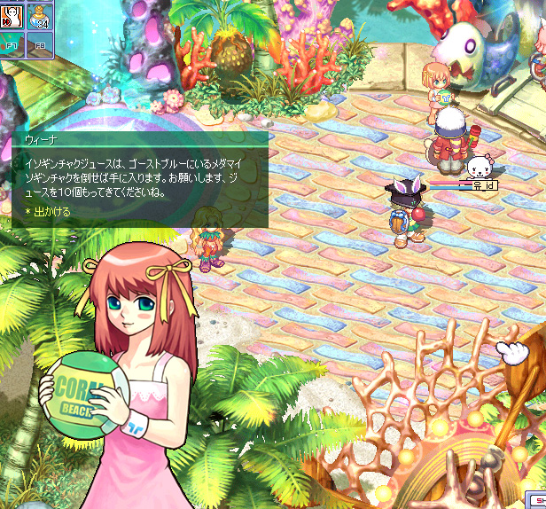 さらにコーラルビーチの町を奥深く進むと,ボールで遊んでいる女の子がいた。このウィーナというNPCのクエストは,ゴーストブルーに出現する"メダマイソギンチャク"から得られる"イソギンチャクジュース"を10個持ってくればOKという内容。うーん,イソギンチャクジュースは使用すればHPを160ほど回復できるアイテムなので,戦闘中に全部使い切っちゃってるなぁ。