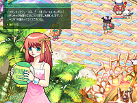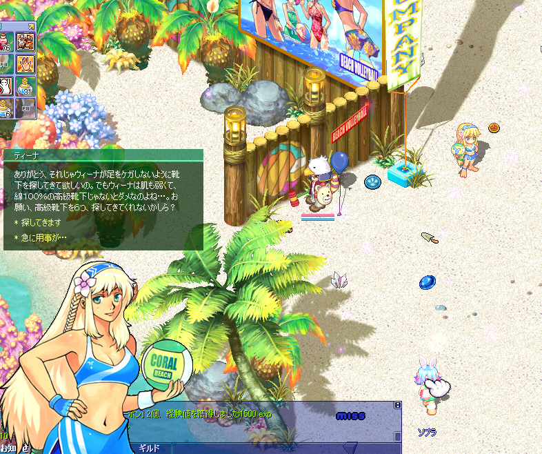 さらに奥深くフィールドを進むと,今度はティーナというNPCがいた。町にいた女の子,ウィーナの姉であるらしい。ようやく待望の水着美女の登場である。彼女から受けられるクエストは,"高級靴下"を6足持ってくるという内容。なんか,中途半端な数だなぁ。