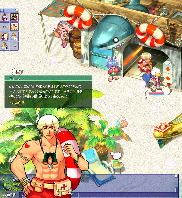 さて,入ってきたのと反対側の出口からフィールドに出て,ウロウロ適当に歩いていると,今度はディーンというNPCを発見。ディーンはビーチの監視員で,彼のクエストは,"水泳帽"というアイテムを五つ持っこいというもの。