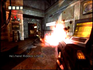 プレイヤーは一人称視点でリディックに扮し,銃器によるシューティングや「スプリンターセル」ライクなスニークアクションを楽しめる。もちろんリディックの特徴でもある"暗視義眼"は健在。暗視義眼はちょっとしたナイトビジョンになると同時に,スニークサイン(敵に見つかったかどうか)としても重宝するし,スニーク中はスピーカーを通して「ドックンドックン」と鼓動が聞こえるという演出もある。