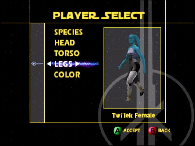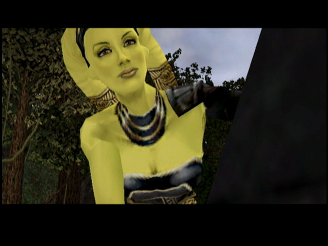 | そんなわけでTwilek(Female:黄色)を作ってみた。画面中央を見ると分かるが,筆者が特別手を加えずとも結構美人だ。ちなみに画面左の頭はルーク・スカイウォーカー,画面右の中央でなんでもない顔をしてるのが,前作の主人公カイル・カターン |