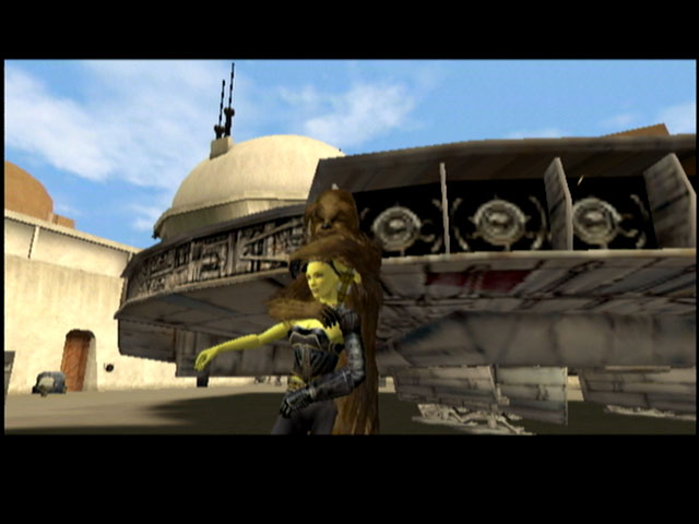 | 世界観はまったくスター・ウォーズなので,砂漠の星タトゥーインを始め,映画ファンには見慣れた場所も多いだろう。画面左は,ミレニアム・ファルコン号の前でじゃれるチューバッカと主人公 |