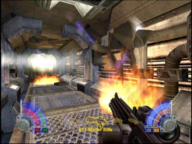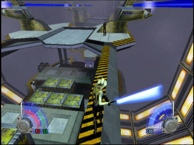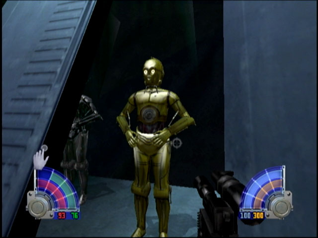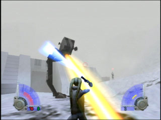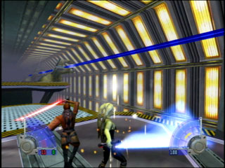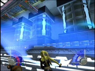 | ライトセーバーを装備しているとき以外は一人称視点,つまりFPSと同じ操作体系となる。ダークサイドのSithも同じくセーバーを持っていて,こちらのライフルなどは完全に跳ね返してくる |