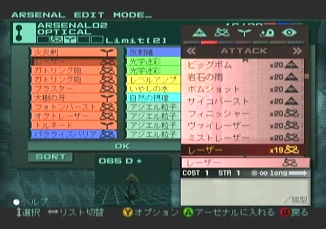 | カジワラやユビキタスといった文官(科学者)が所有する機材を用いて,過去のミッションスコアを見たり,アーセナルを組み立てたりする。中央の画面は,光学/自然の2系統が利用できるアーセナルのカスタマイズ画面。ほんの数個のスキルでも,組み合わせを考え始めるとキリがない |