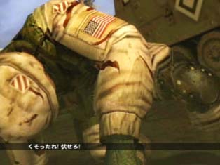 | 敵の銃弾を浴びると,このようにカメラ(?)に鮮血が飛び散る。あえなく倒れてしまった場合も,命が尽きる前に医療班に届ければ,不意にムックリと復活してくれる。な,なにしたの!? |