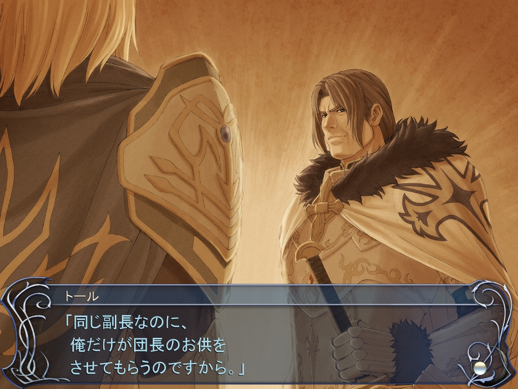 ここで,女神捜索隊のそれぞれのメンバーの立場から,トールがどのような人物として映るのかを考えてみてほしい。例えばユーゴにとってはコンプレックスを感じさせる兄であり,ユニカにとっては亡き父の部下だ。また神殿騎士団のガレオンにとっては,かつて共に肩を並べ戦った同胞でもある。