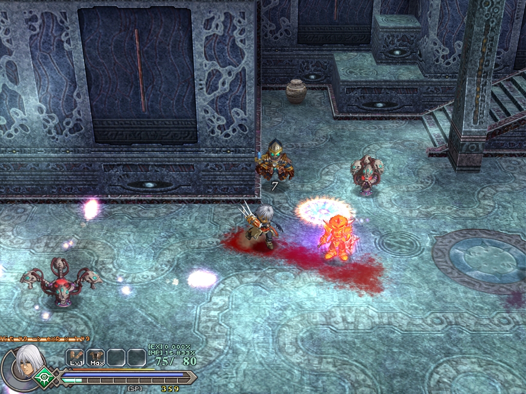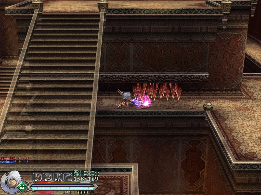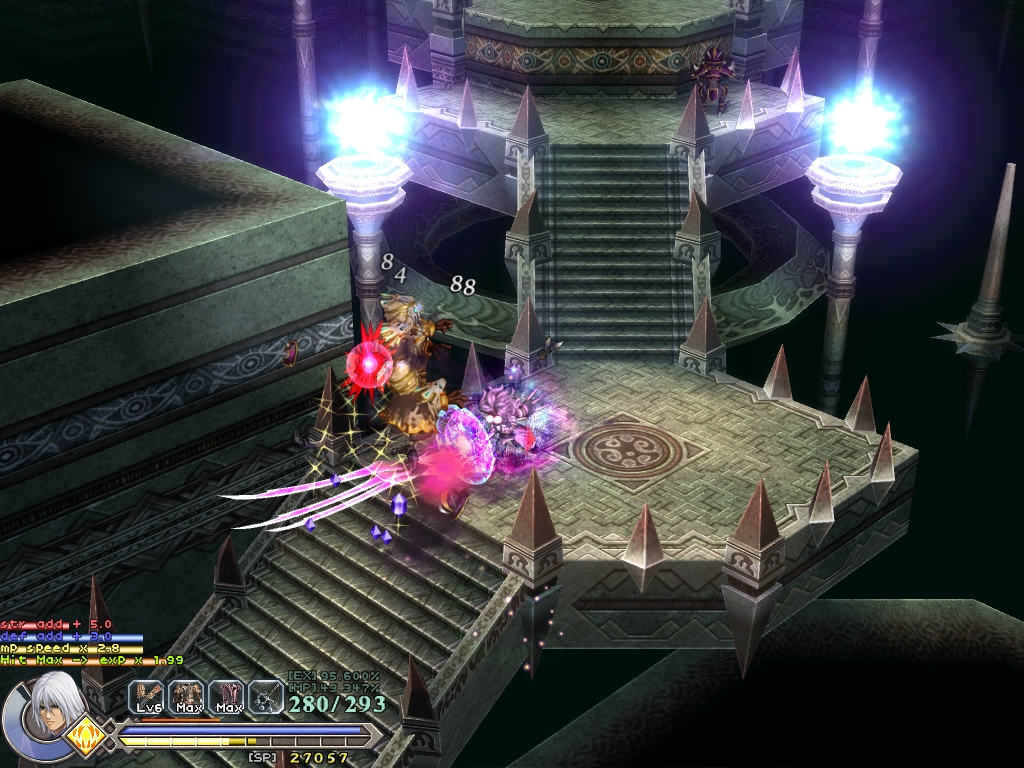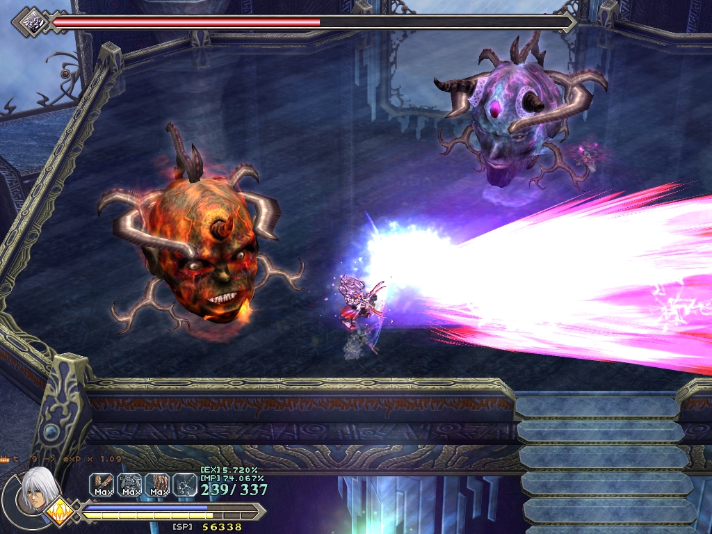 スキルはユニカやユーゴと同様,3属性用意されている。最初に習得できる「風」のスキルは,瞬間移動を伴った攻撃を行う。この移動先は二通りの指定ができ,方向キーを入れている場合はその方向へ,移動キーがニュートラルの状態だと,最も近くにいる敵へと自動的に向かっていく。つまりスキル使用ボタンだけを連打すれば,MPの続く限り勝手にモンスターを狙い続けてくれるのだ。