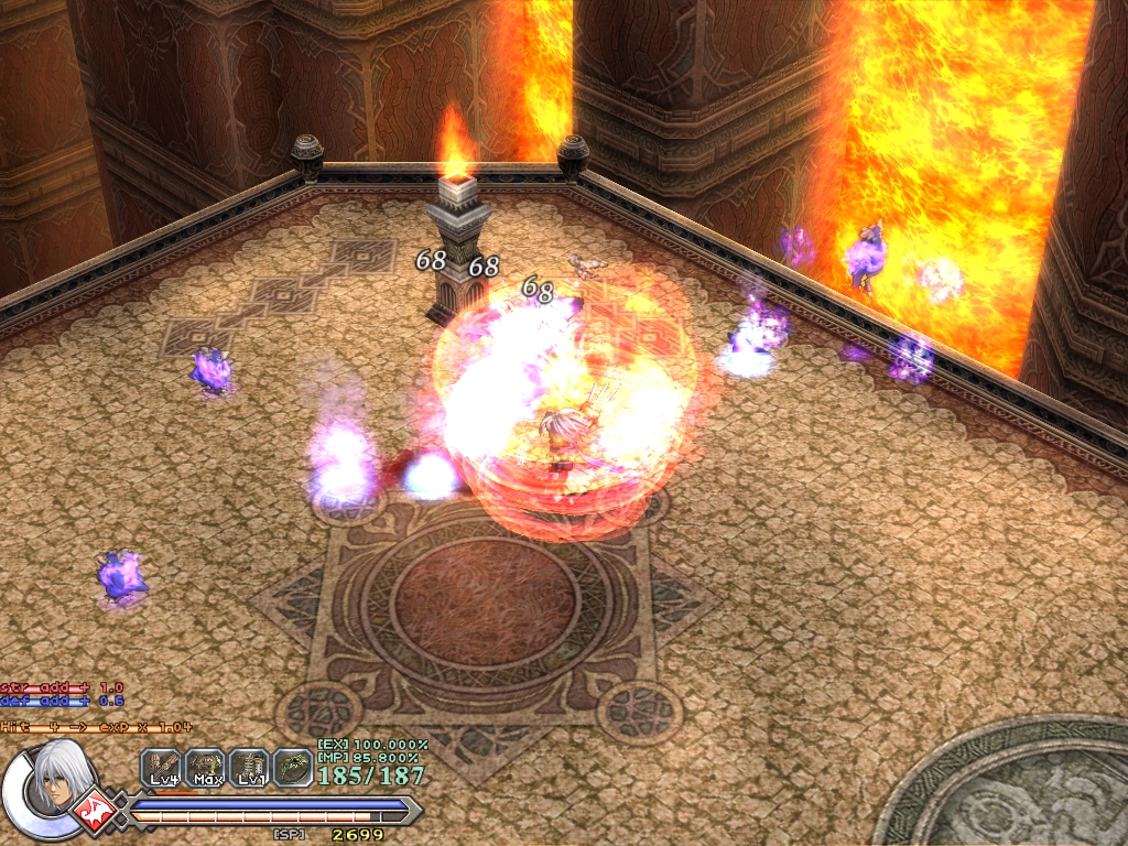 | 炎のスキルは頭上方向への攻撃範囲の広さに目が向きやすいが,実は足元の当たり判定もそれなりの広さがある |